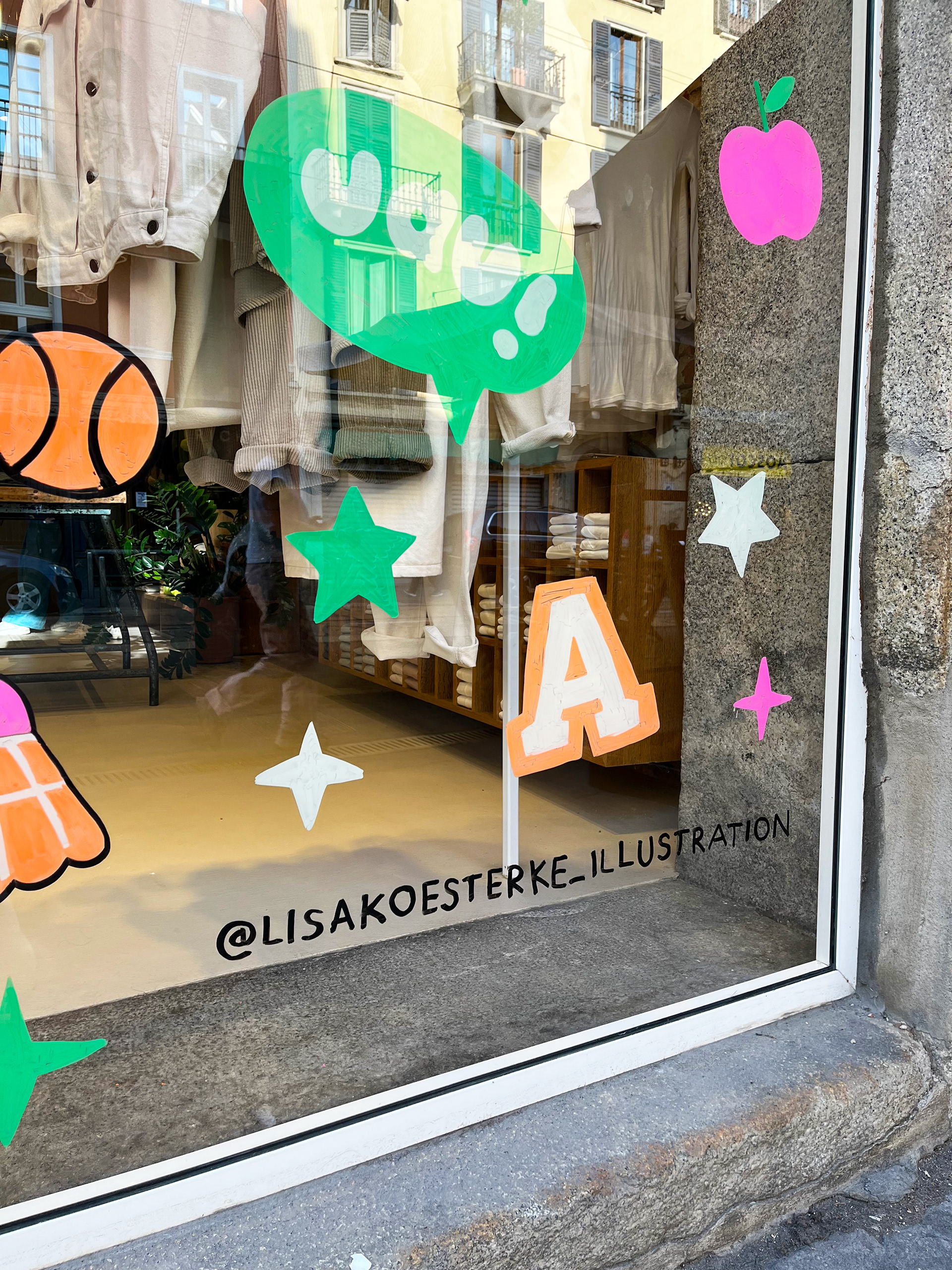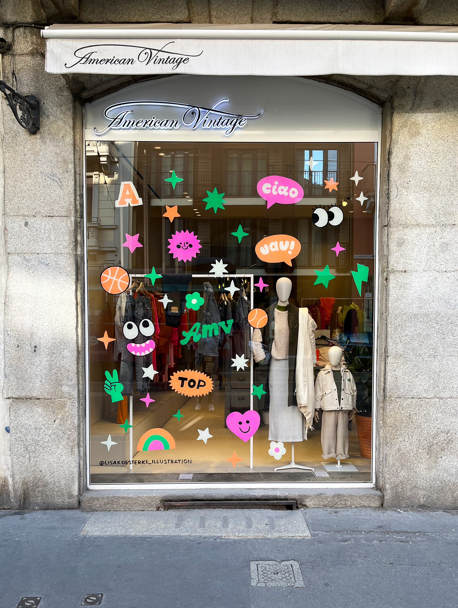 I was commissioned by French fashion brand, American Vintage to design and paint a window display for their Milan store in the autumn of 2023. The design was inspired by the bright colours and playfulness of the new American Vintage children's collection and celebrates the bold American varsity style with an Italian twist.