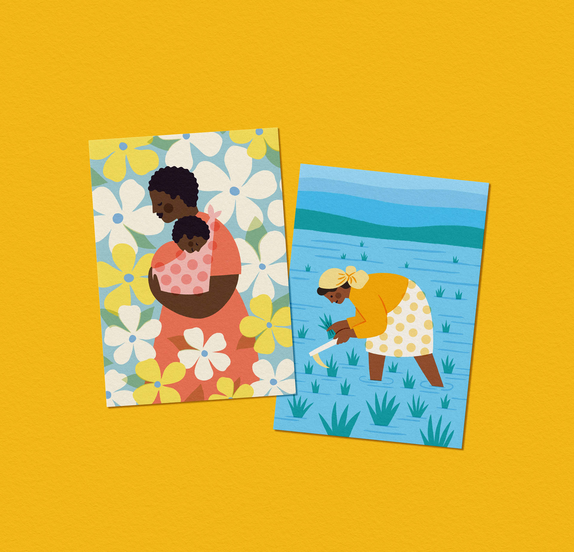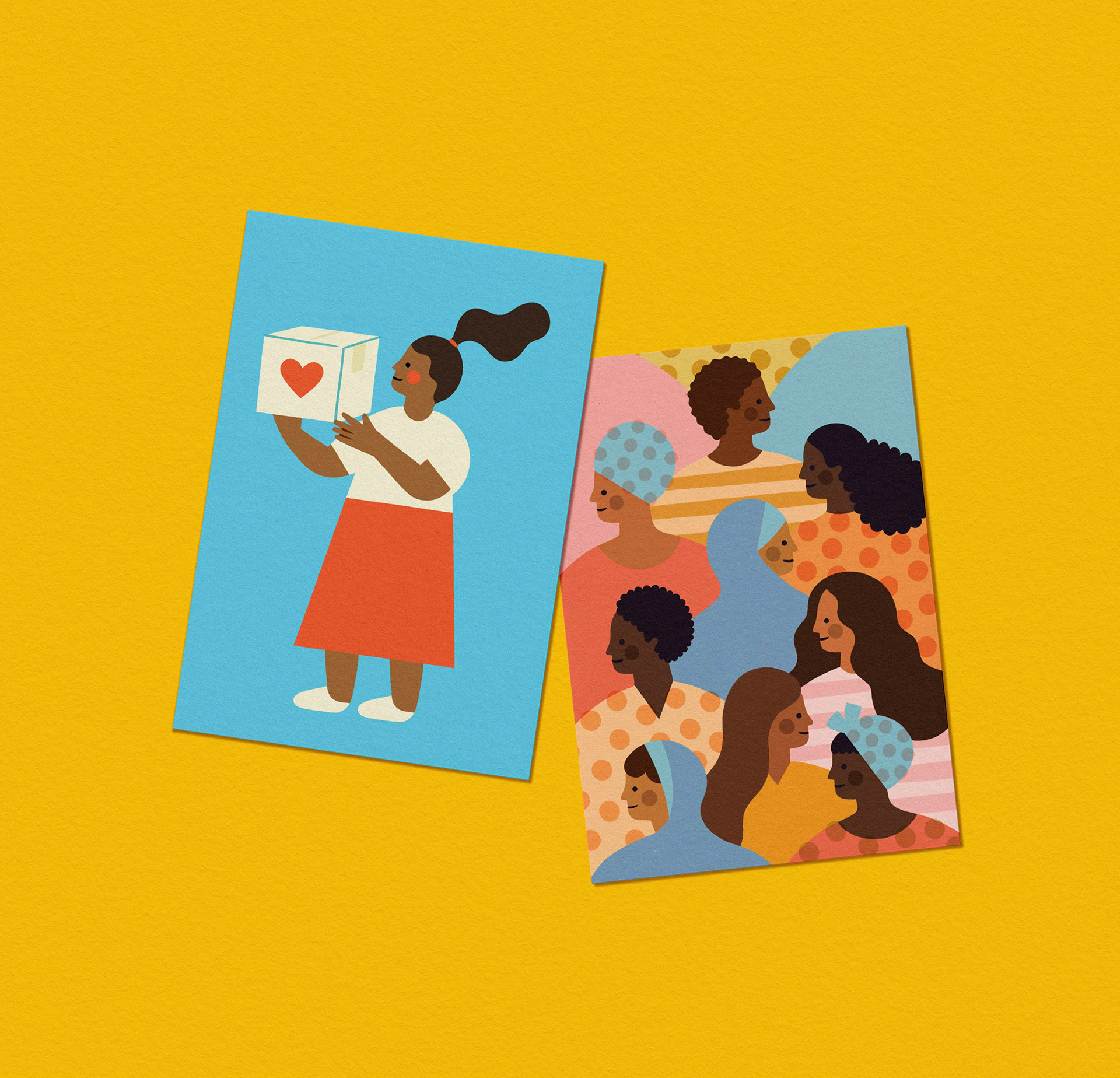 These illustrations were commissioned by CARE Australia, an international aid organisation fighting against poverty for the relaunch of the CARE Gifts collection. Each card allows the buyer to donate money to a particular cause such as providing hygiene kits to women and girls or supplying a community with a source of clean water.